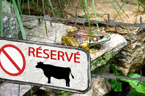 Mas no meio do caminho não havia uma pedra: estanco no arame farpado. Tento uma… duas… três… quatro vezes pular a barreira. Porém não tenho forças; exausto que estou. Pela camiseta rasgada, um filete de sangue escapa. A vaca olha pra mim e solta um longo e monótono mugido. Na borda do bebedouro metálico, uma rã — possível leitora de Aristófanes —, parece dizer “brekekekex, koax, koax”